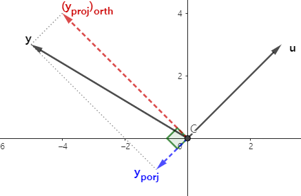 벡터 u에 직교투영된 벡터 y의 yproj와 그 투영된 벡터의 수직인 (yproj)orth을 결정합니다.